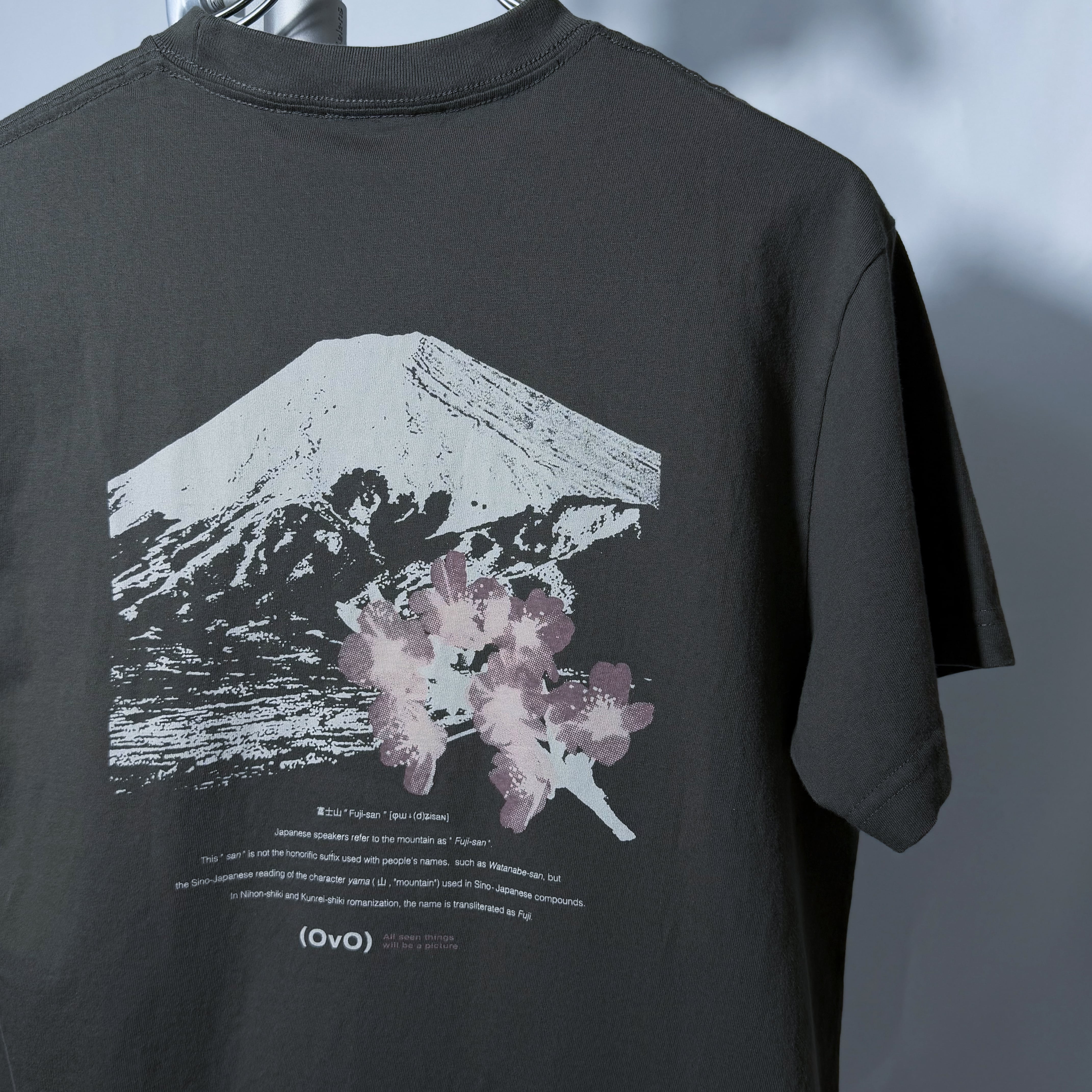 富士吉田市下吉田から眺める富士山の風景をデザインに取り入れた「OvO Souvenir Tee」は、富士山と桜が描かれたバックプリントが印象的なカットソーです。このアイテムは、自然の美しさを身にまといながら、カジュアルなスタイルを楽しむことができます。ユニセックスデザインなので、男女問わずご愛用いただけます。