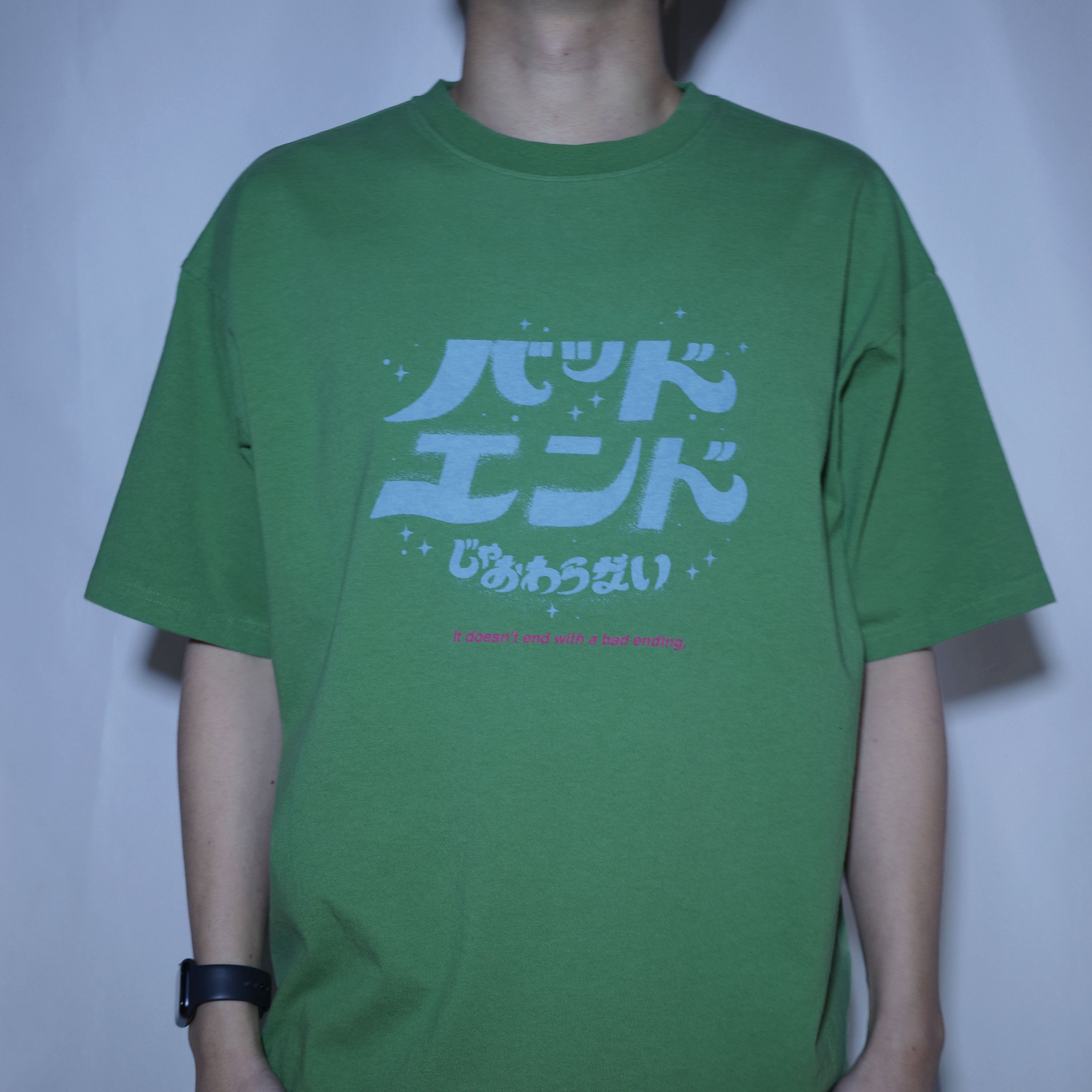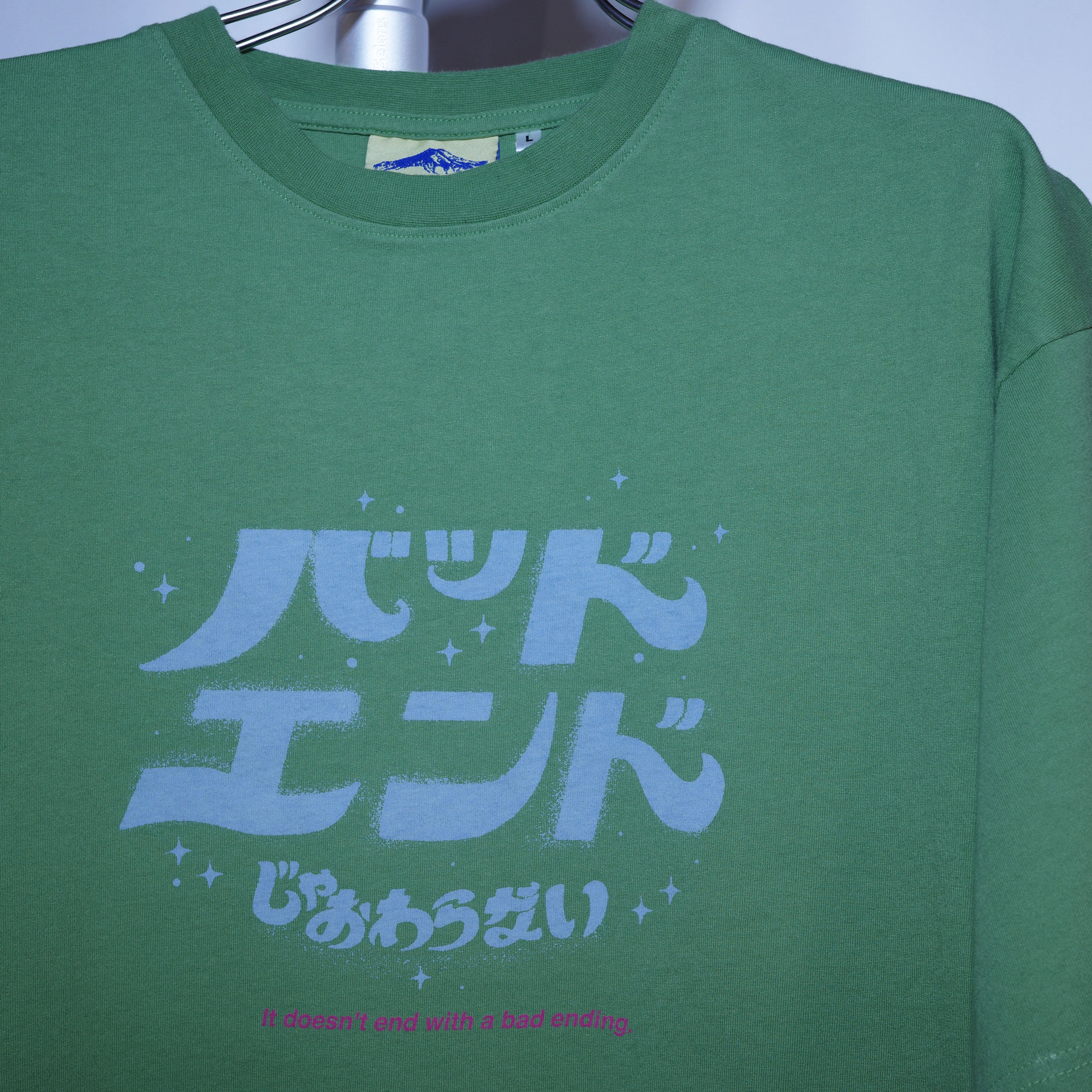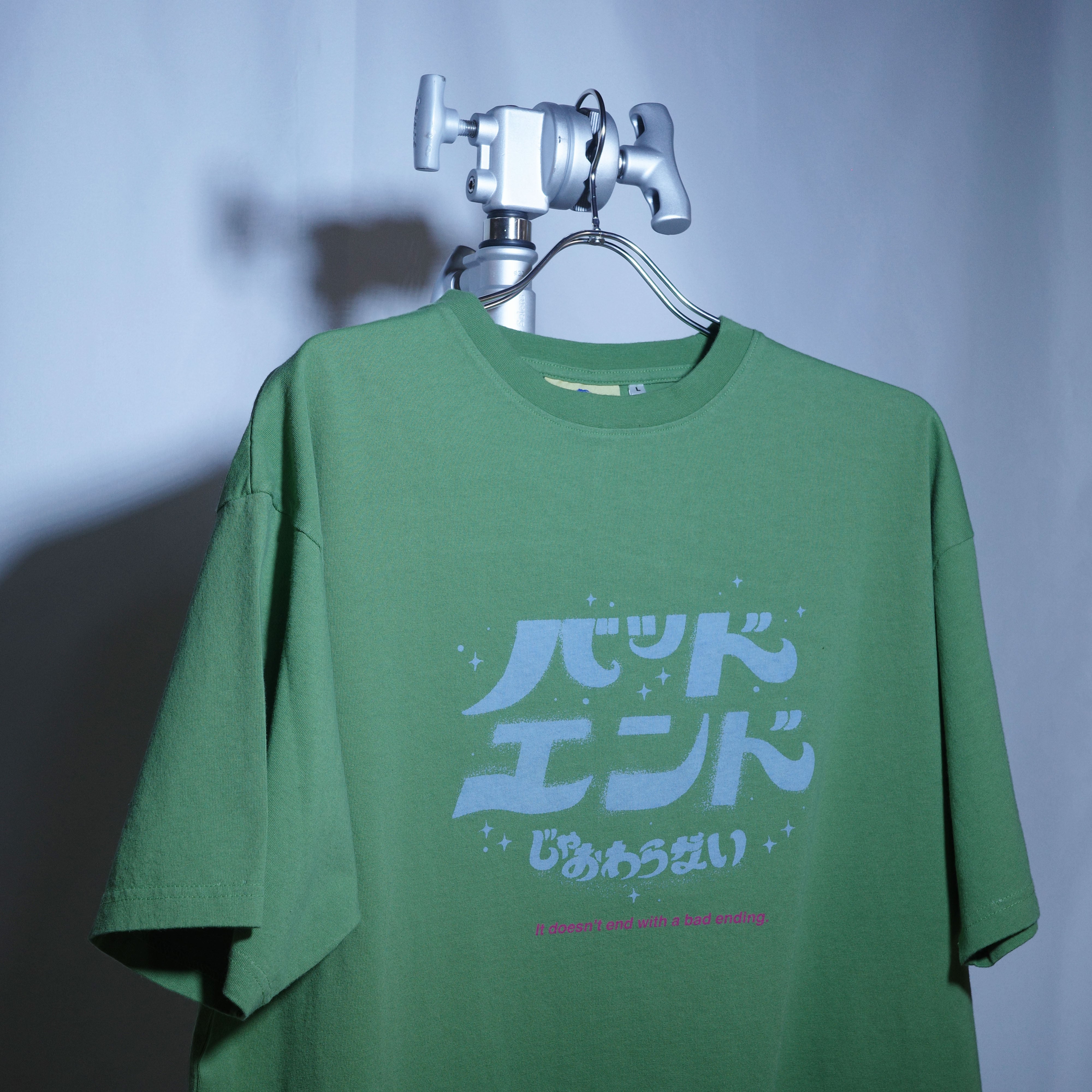 「(OvO) KHAKI It doesn't end with a bad ending Tee」は、ポップでユニークな日本語のメッセージがプリントされたプルオーバーです。日常のコーディネートに遊び心を加える、個性的な一着としてお楽しみいただけます。