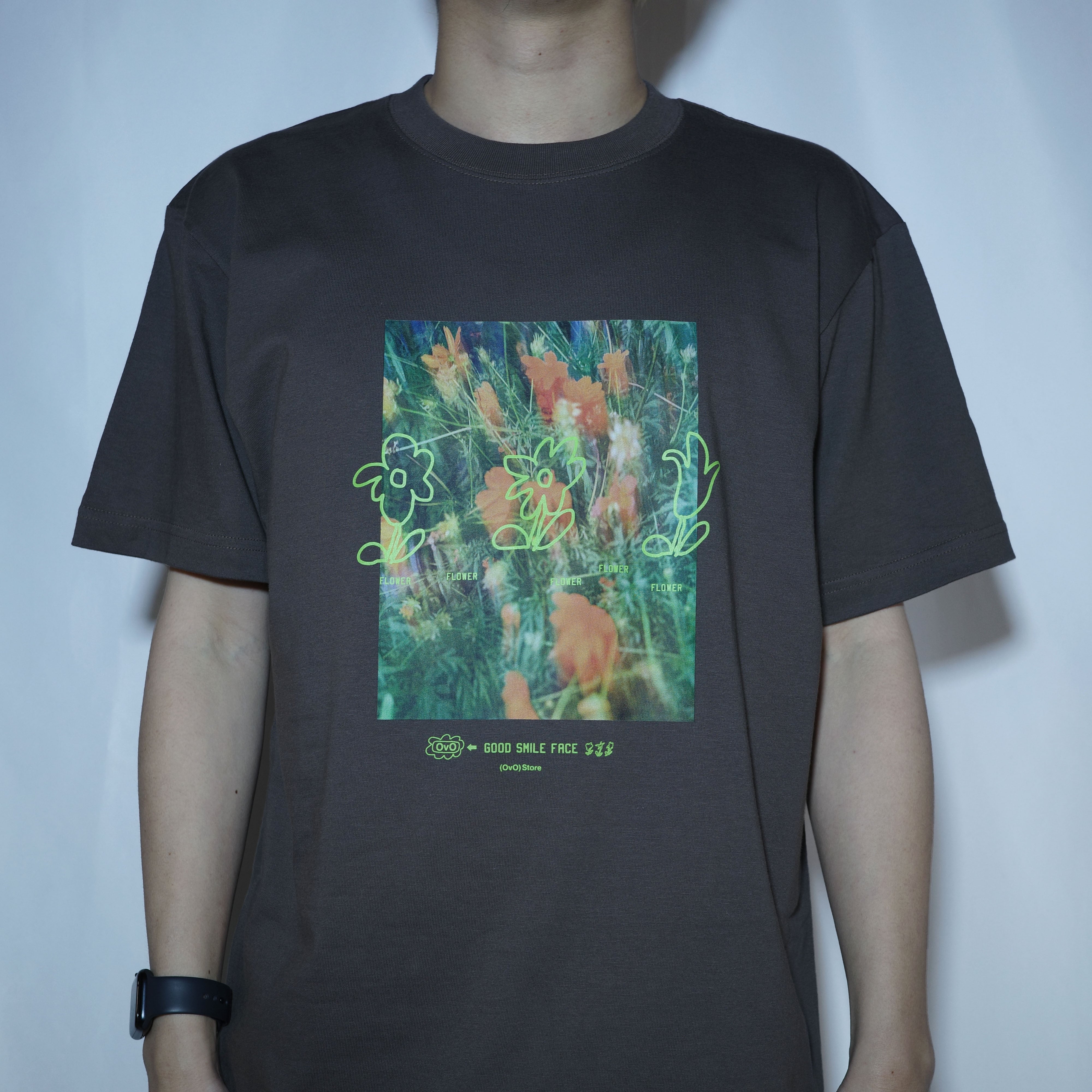 「(OvO) CHARCOAL GOOD SMILE FACE Tee」は、フラワーフォトと手書きのフラワーをミックスした遊び心のあるカットソーです。ユニセックスなデザインなので、どなたでも気軽に着用いただけます!