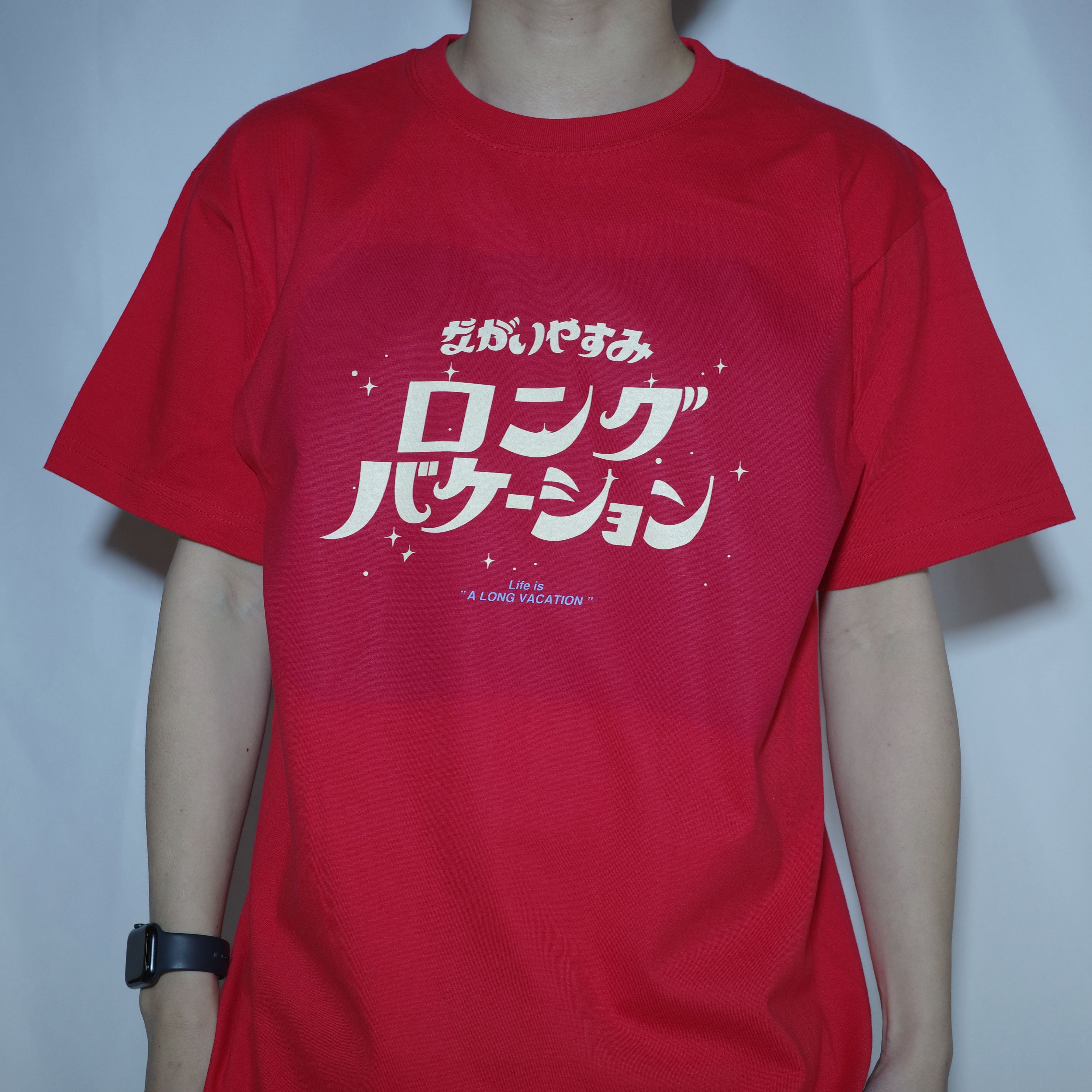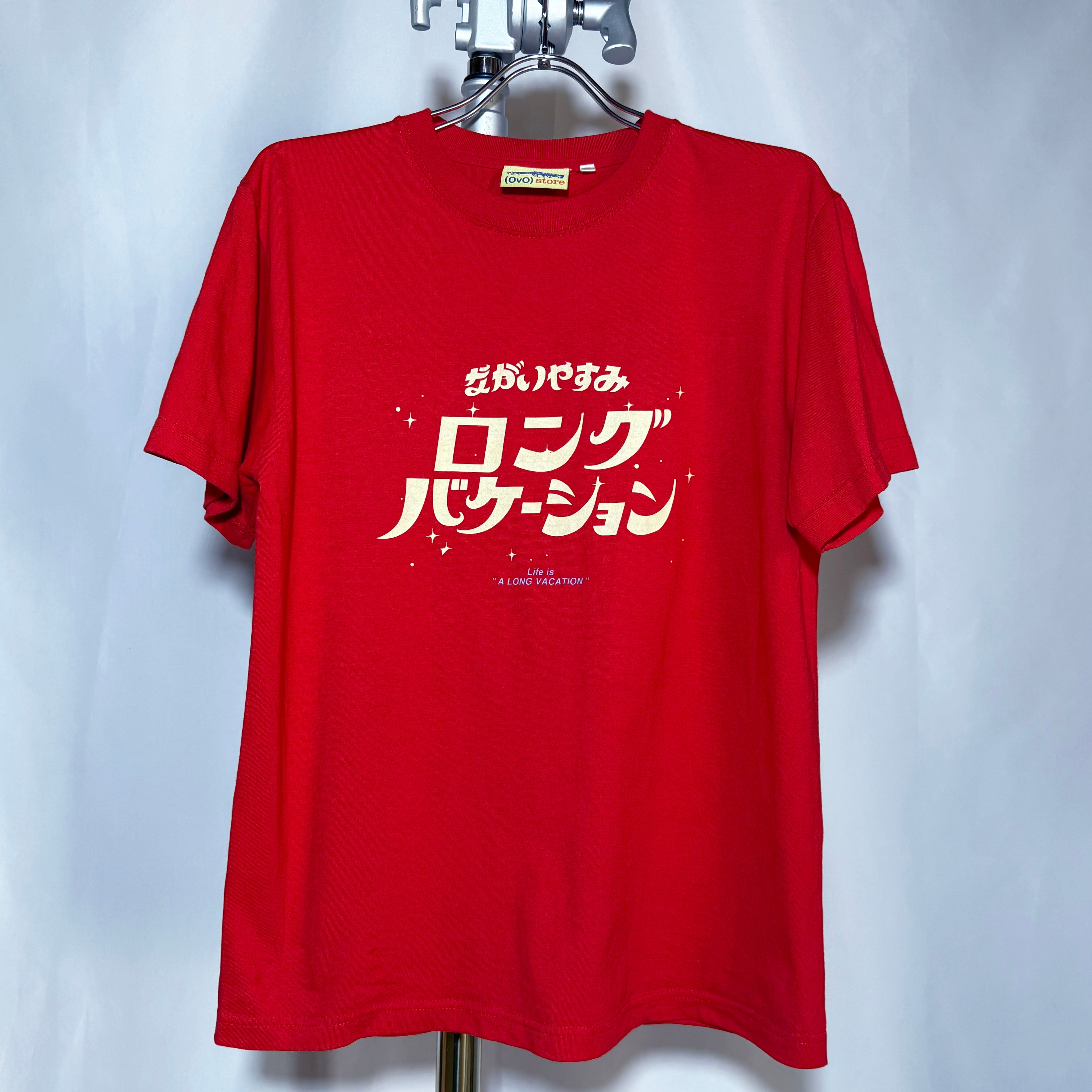 「(OvO) RED Long Vacation Tee」は、ポップでユニークな日本語のメッセージがプリントされたカットソーです。日常のコーディネートに遊び心を加える、個性的な一着としてお楽しみいただけます。