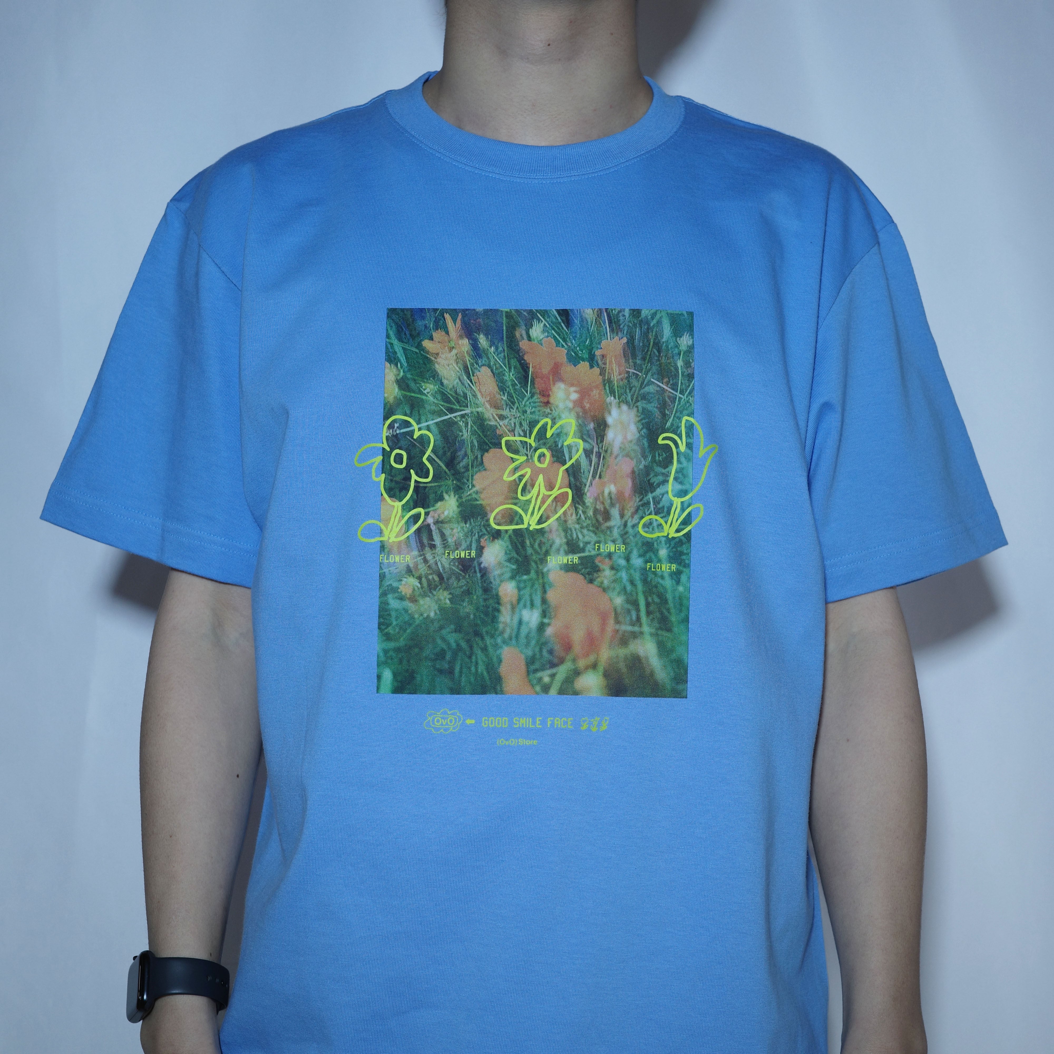 「(OvO) SAX GOOD SMILE FACE Tee」は、フラワーフォトと手書きのフラワーをミックスした遊び心のあるカットソーです。ユニセックスなデザインなので、どなたでも気軽に着用いただけます!